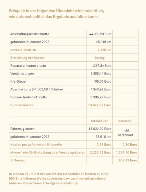 Erstattet der Arbeitgeber die Kosten für dienstliche Fahrten nicht, können diese als Werbungskosten in der Einkommensteuererklärung geltend gemacht werden, wobei ebenfalls zwischen beiden Varianten gewählt werden darf. Um damit einen steuerersparenden Effekt zu erzielen, sollten die übrigen angesetzten Werbungskosten über der Werbungskostenpauschale von 1.230 Euro (für 2025) liegen.
